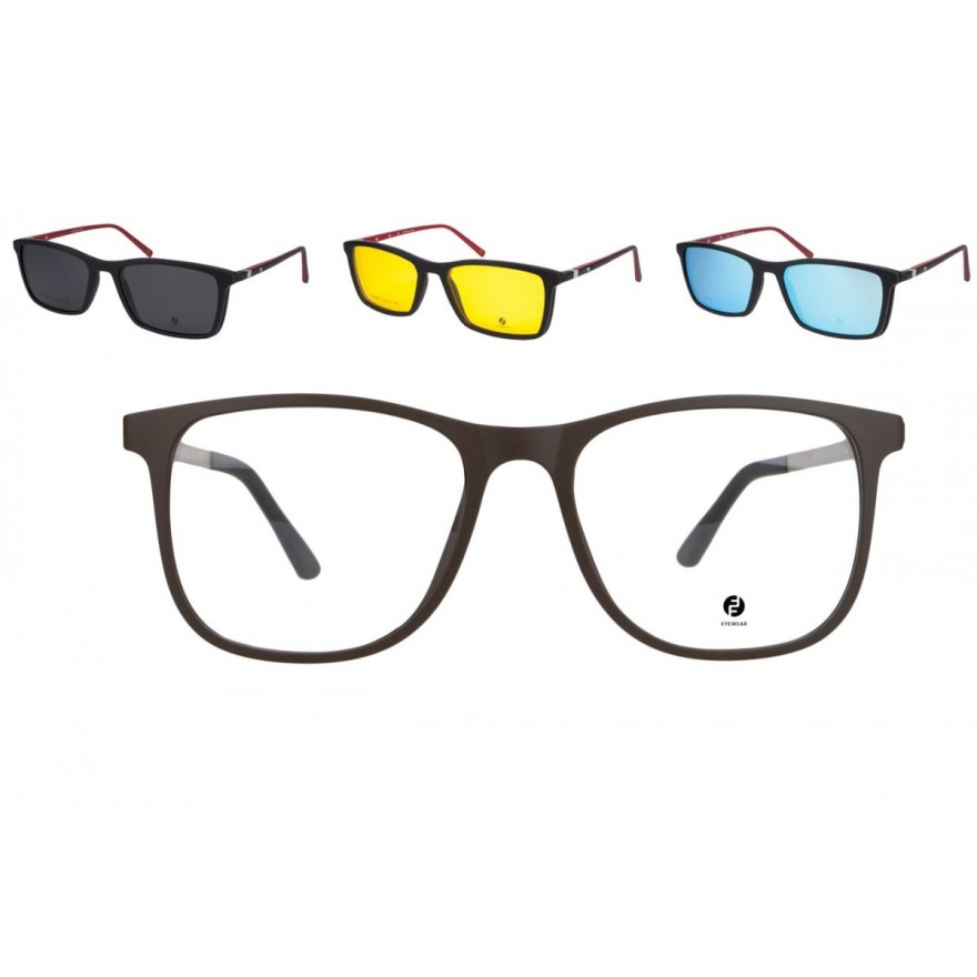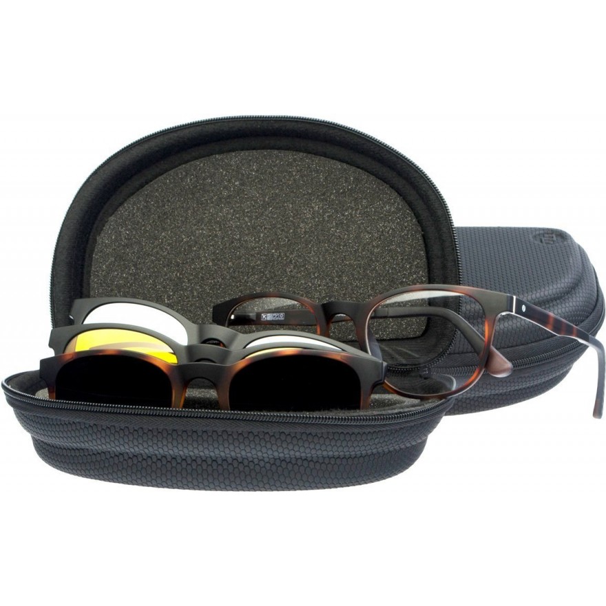 Oprawa okularowa do szkieł korekcyjnych wykonana z materiału -ULTEM(bardzo lekki i wytrzymały materiał z właściwościami hipoalergicznymi) w zestawie z 3 nakładkami typu Clip On. Nakładki mocowane na magnes do oprawki. Posiadające filtr UV400 oraz polaryzację. Nakładki w 3 różnych wersjach z powłokami: lustrzany niebieski, szary oraz Blueblocker